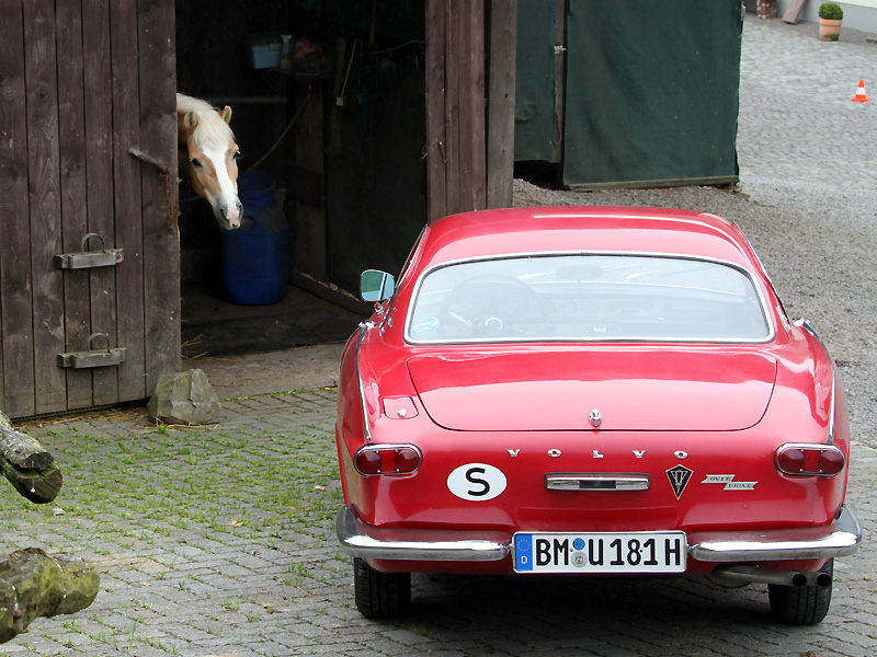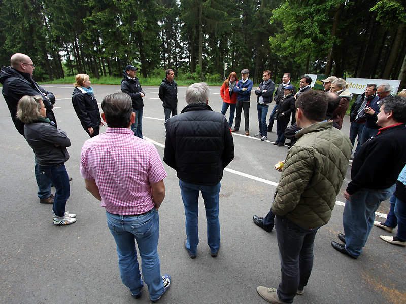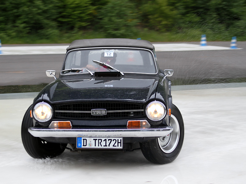 Der späte Nachmittag ist dann der Fahrphysik gewidmet, traditionell die Stunde, in der Helden geschaffen werden. Im Fahrsicherheitszentrum wird die Bewässerungsanlage in Betrieb genommen und eine gleitfähige und deshalb fahrwerksschonende Oberfläche erzeugt. Dazu die „Platte“, die die Fahrzeuge bei der Überfahrt mit der Hinterachse mit einer Seitwärtsbewegung in Drehung versetzt. Sie schlägt in drei Stufen: schwach, mittel und gemein. Für die Fahrer gilt: Wo kein ESP die Sache regelt, helfen nur die guten alten Reflexe und Tipps von Matthias Kahle, denn der ist vermutlich schon quer driftend auf die Welt gekommen. Aber es bleibt der Zweikampf Mensch gegen Platte, der zu richtig harter Arbeit werden kann: So wie für Dr. Ulrich Busch im Volvo P 1800, Baujahr 1963. Denn Volvo hat damals Lenkungen für Männer gebaut, die Elchdrücken als Hobby hatten.